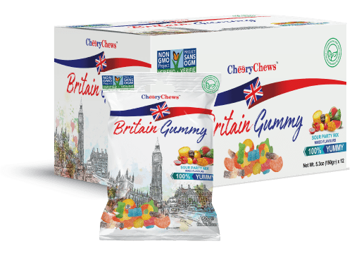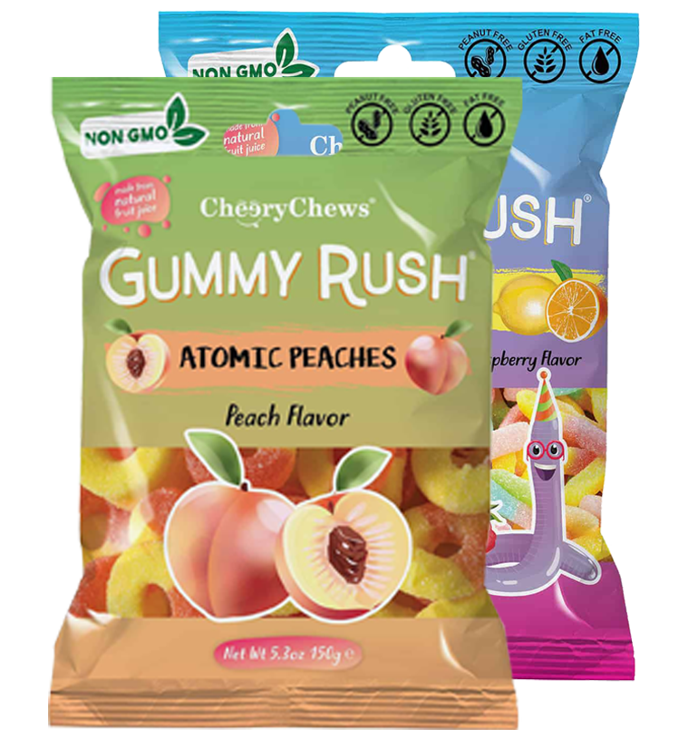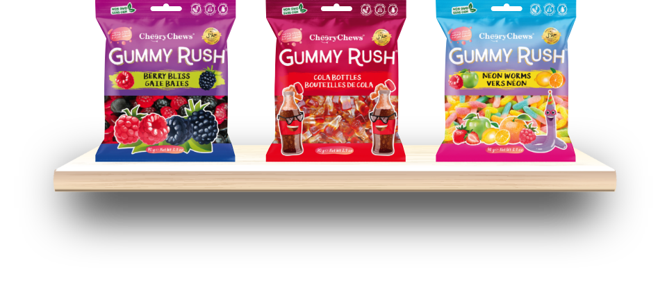 Our delicious gummy varieties include Atomic Peaches, Berry Bliss, Blue Sharks, Cola Bottles, Baby Bottles, Fizzy Cherries, Gummy Bears, Gummy Unicorns, Gummy Worms, Neon Worms, Tiny Turtles and Sour Party Mix.